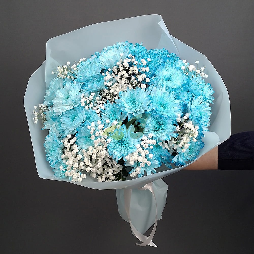 Нежно голубые хризантемы и белые гипсофилы можно купить для любимой жены. Напомните ей о том, как сильно вы ее любите, как она вам дорога.