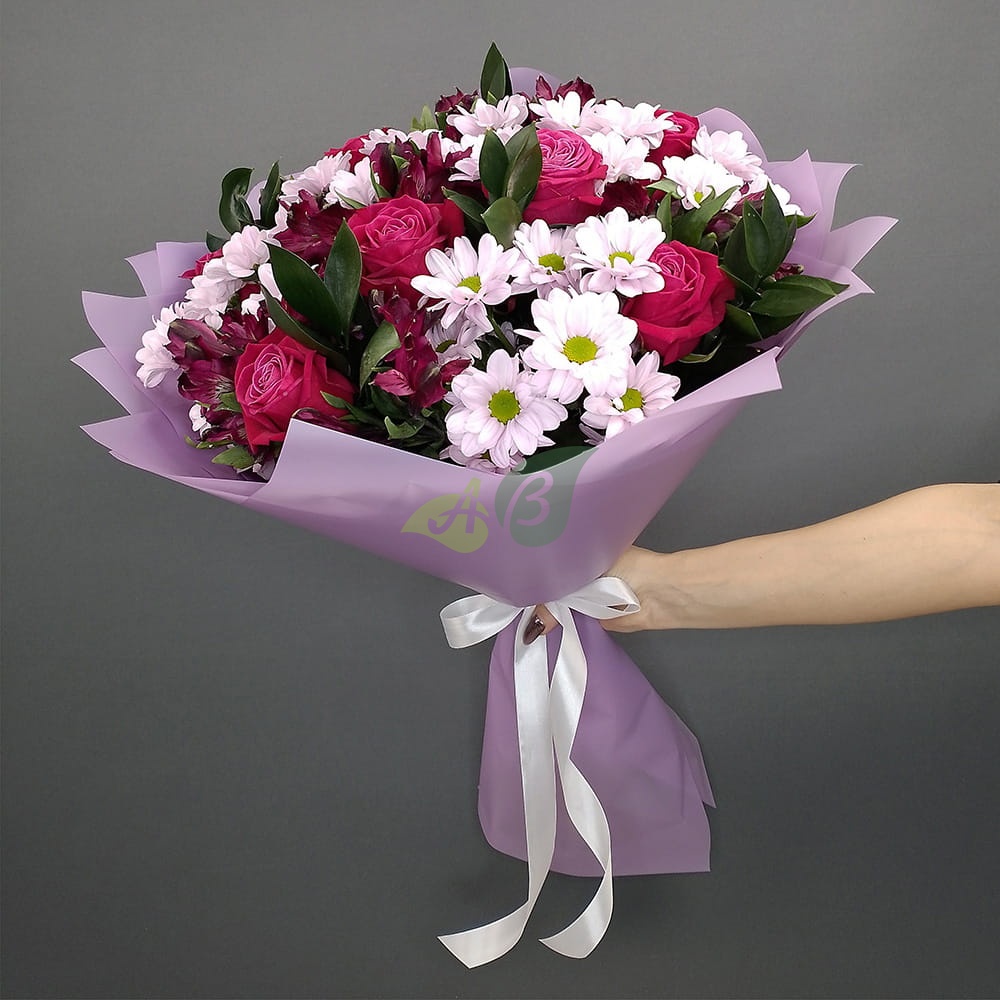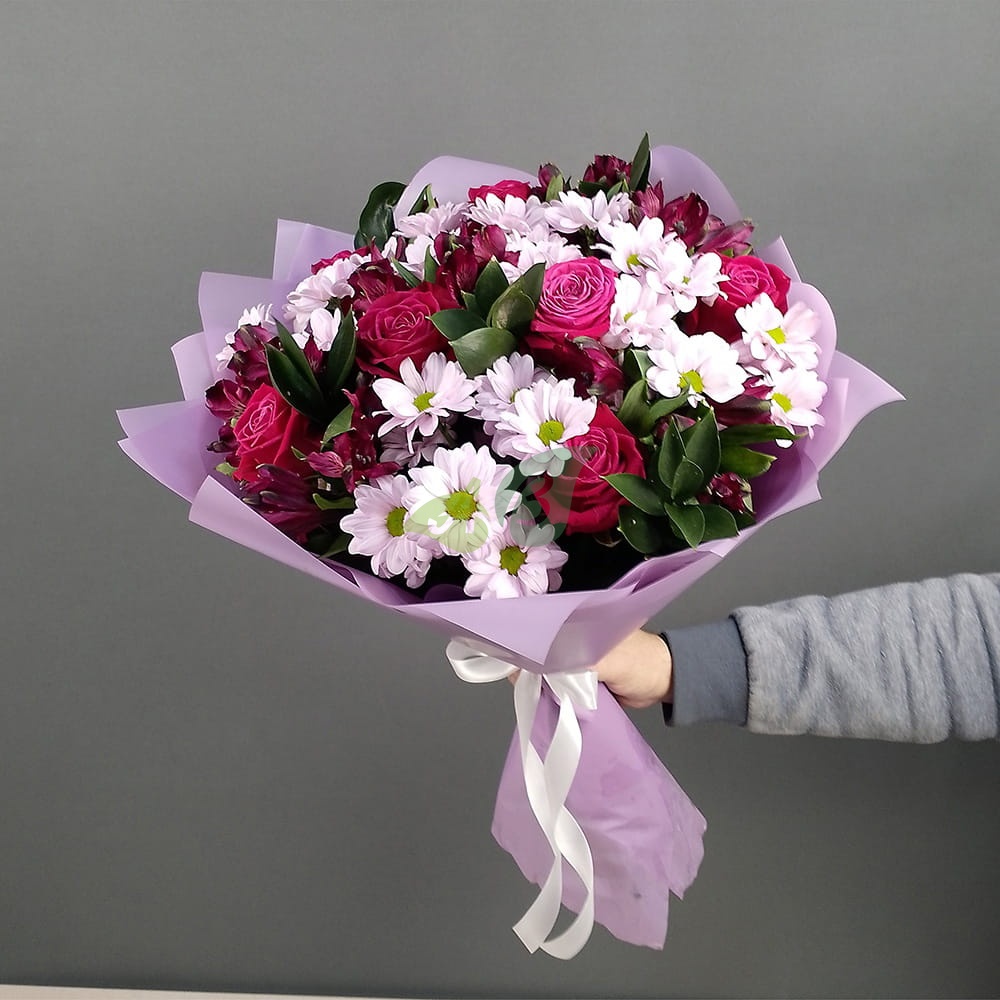 “Спелая вишня” – это невероятно красочный букет, который включает в себя розовые розы, нежно-сиреневую хризантему и фиолетовые альстромерии. Мы создали эту композицию, чтобы вы могли не думать, какие цветы заказать на 14 февраля. Она расскажет лучше слов о пылких чувствах и внесет яркие краски в холодный зимний день.